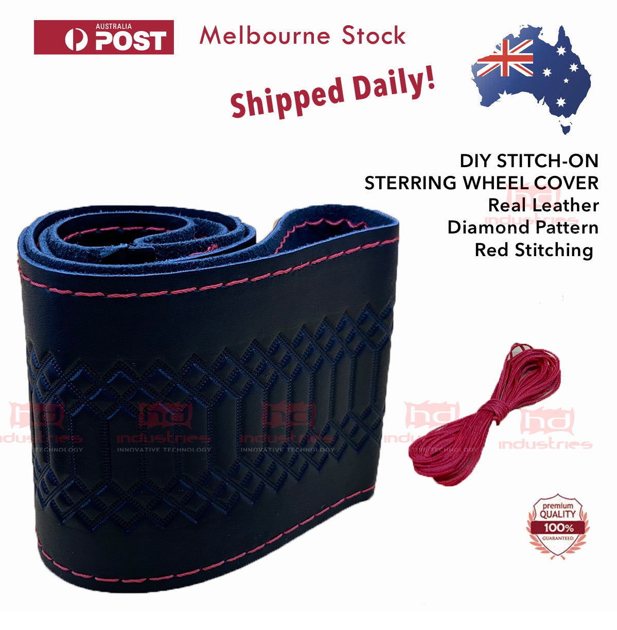 DIY Leather Steering Wheel Cover- Cross + Diamond Luxury Sports pattern, Black Leather with Red Stitching